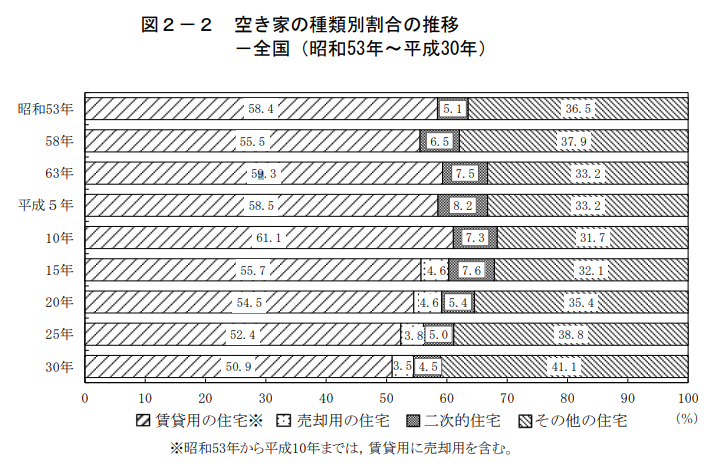 その他住宅とは・・・「賃貸用の住宅」「売却用の住宅」「二次的住宅」以外の住宅で,例えば,転勤・入院などのため居住世帯が長期にわたって不在の住宅や建て替えなどのために取り壊すことになっている住宅のほか,空き家の区分の判断が困難な住宅などを含む。